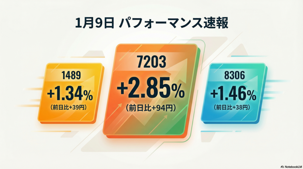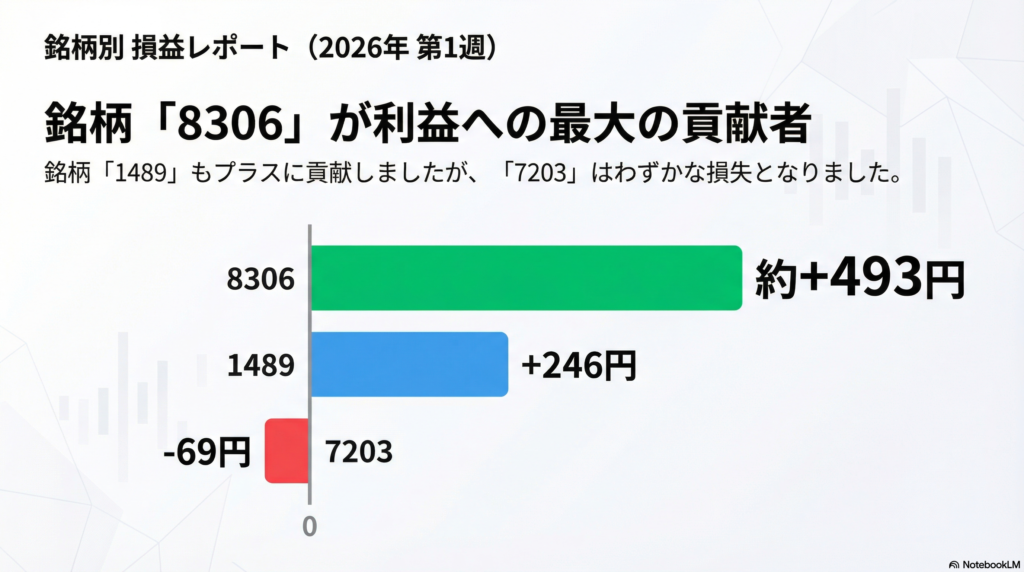 - プラス寄与:8306(三菱UFJ)≈ +492〜+494円、1489(高配当ETF)+246円