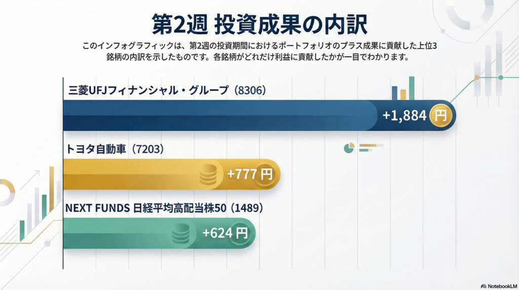 第2週の終値ベースでは、ポートフォリオ評価額は28,943円→32,228円となり、累計損益は+3,285円となった。最も寄与したのは三菱UFJフィナンシャル・グループ(8306)で評価益は+1,884円。トヨタ自動車(7203)も評価益は+777円。NEXT FUNDS 日経平均高配当株50(1489)も+624円とプラスを維持した。