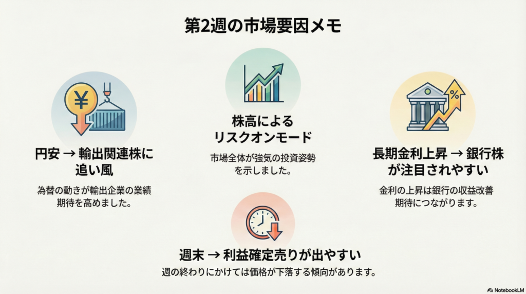 第2週の値動きは、ざっくり整理すると次のような流れと相性が良い週でした。