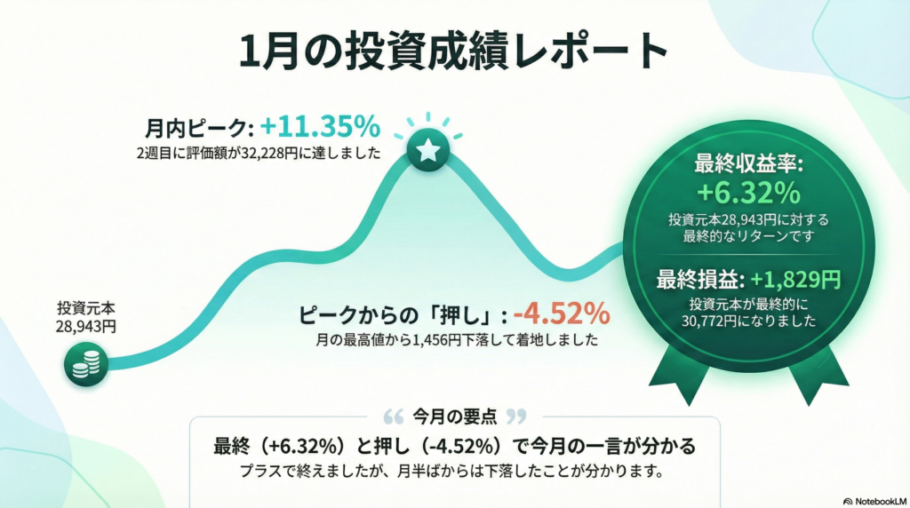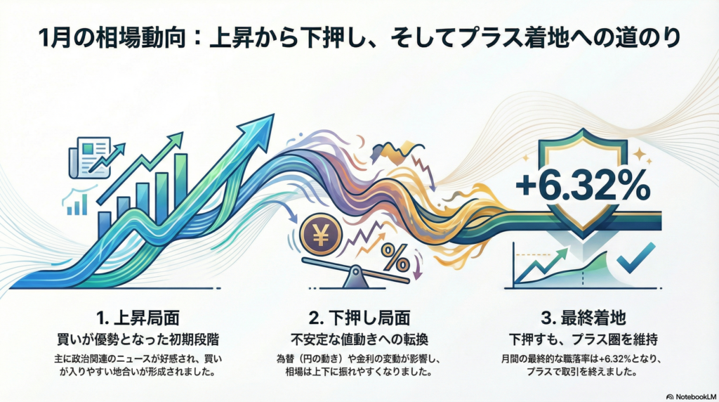 結論:1月は「前半で伸びて、後半で押した」。それでも最終はプラスで着地。