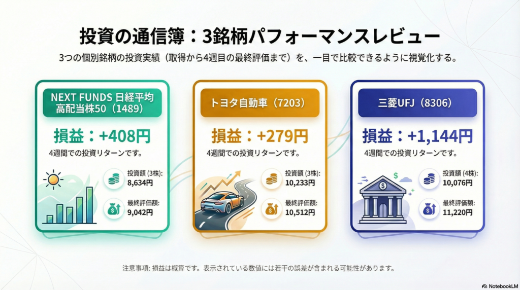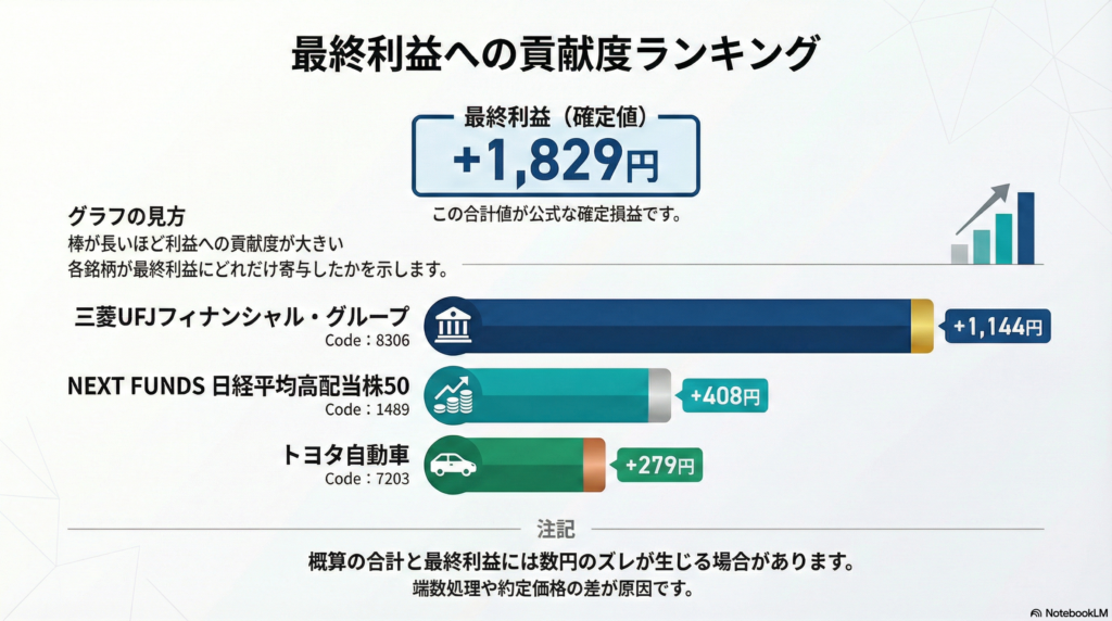 結論だけ短く言うと、稼ぎ頭は三菱UFJ(8306)、クッション役は高配当ETF(1489)。