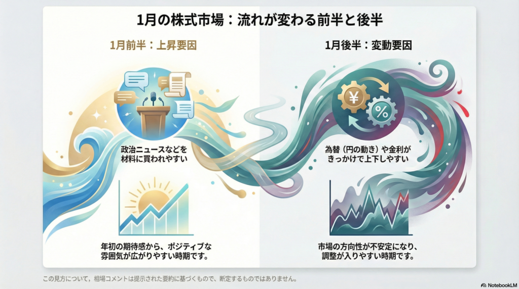 1月は、政治ニュースで買われやすい場面がある一方で、為替(円の動き)や金利で上下しやすい「材料で振れやすい月」でした。