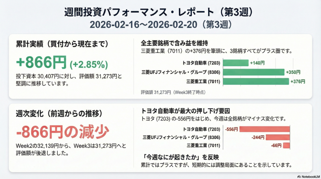 結論:第3週(2/16〜2/20)の評価は +866円(約+2.85%)です。 根拠:評価額 31,273円 − 投下額 30,407円 = +866円。