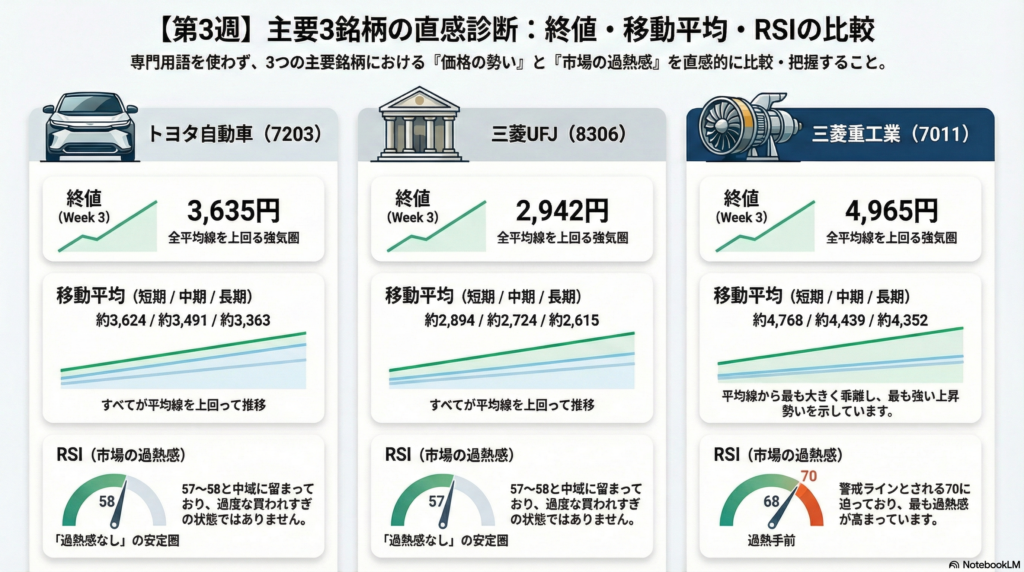 第3週は「3銘柄すべてが(Week2→Week3で)下がった」のに、合計がプラスに残った点がポイントです。