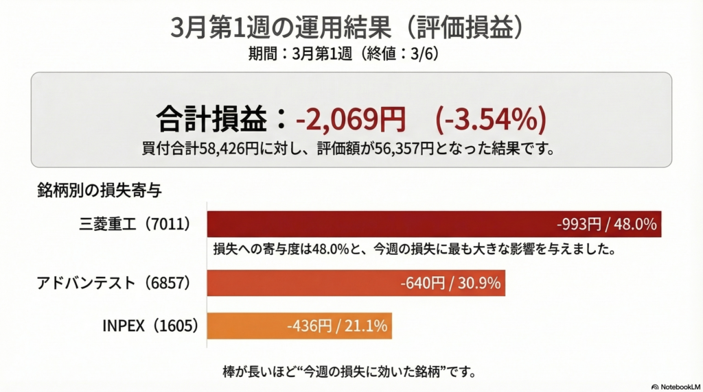 3月第1週の合計損益は -2,069円(-3.54%)でした。