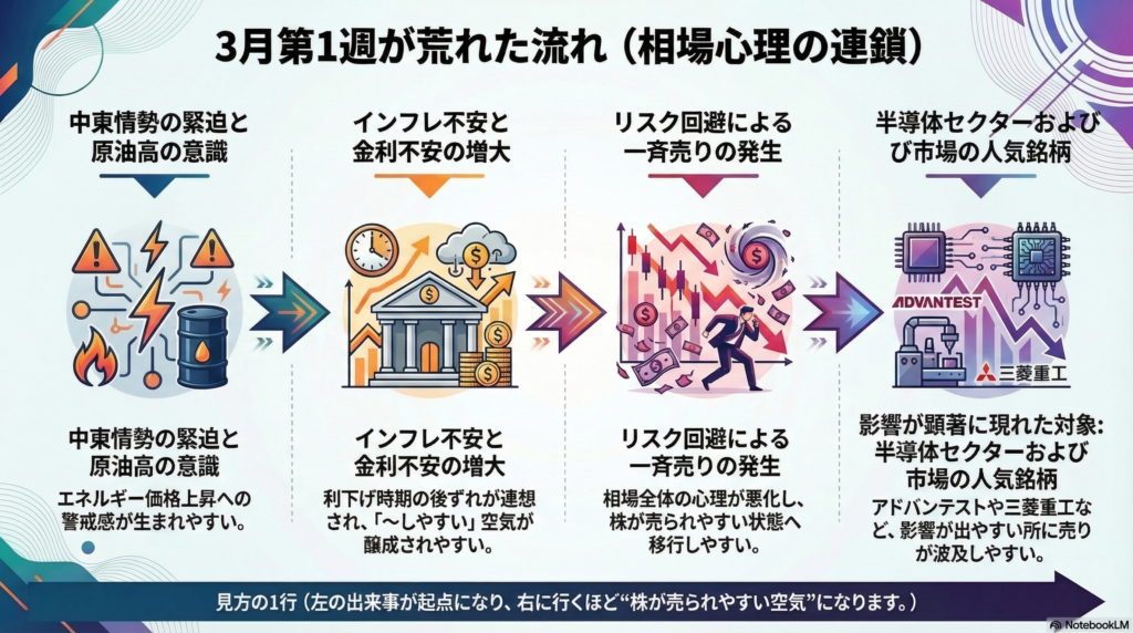 今週の下げは「個別の悪材料」より「相場の連想ゲーム」が大きかった週です。 理由は3つにまとめると理解しやすいです。