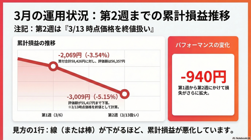 第2週評価額(3/13扱い):55,417円 → 損益 -3,009円(-5.15%)