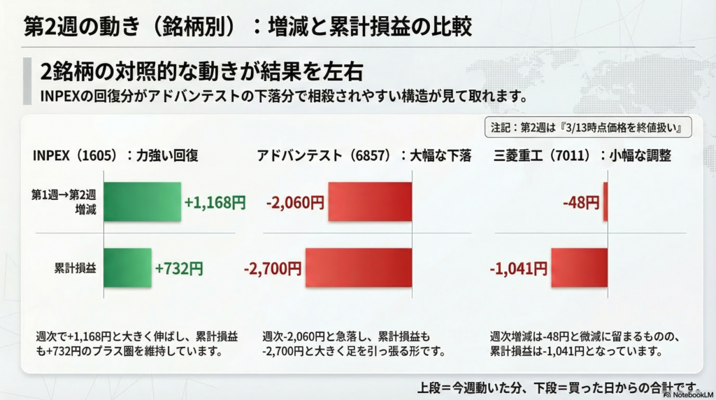 結論:3月第2週は「INPEXの回復より、アドバンテストの下げが重い」週でした。