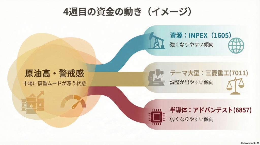 4週目は「資源に集まり、半導体から抜ける」形が強く、逆風が直撃しました。